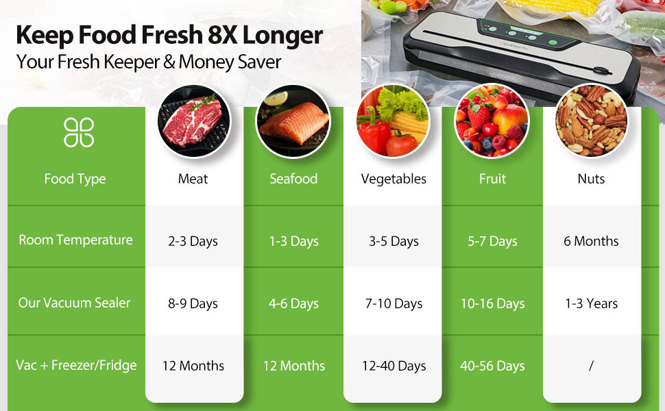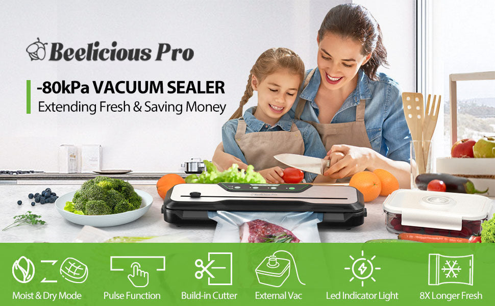 - 【80kPa Powerful Suction & 8X Freshness】Beelicious Pro 80kPa upgraded powerful vacuum pump provides strong suction, along with advanced sealing technology, keeping your food fresh for up to 8X times longer, protecting your food from freezer burn and saving your money & fridge space.