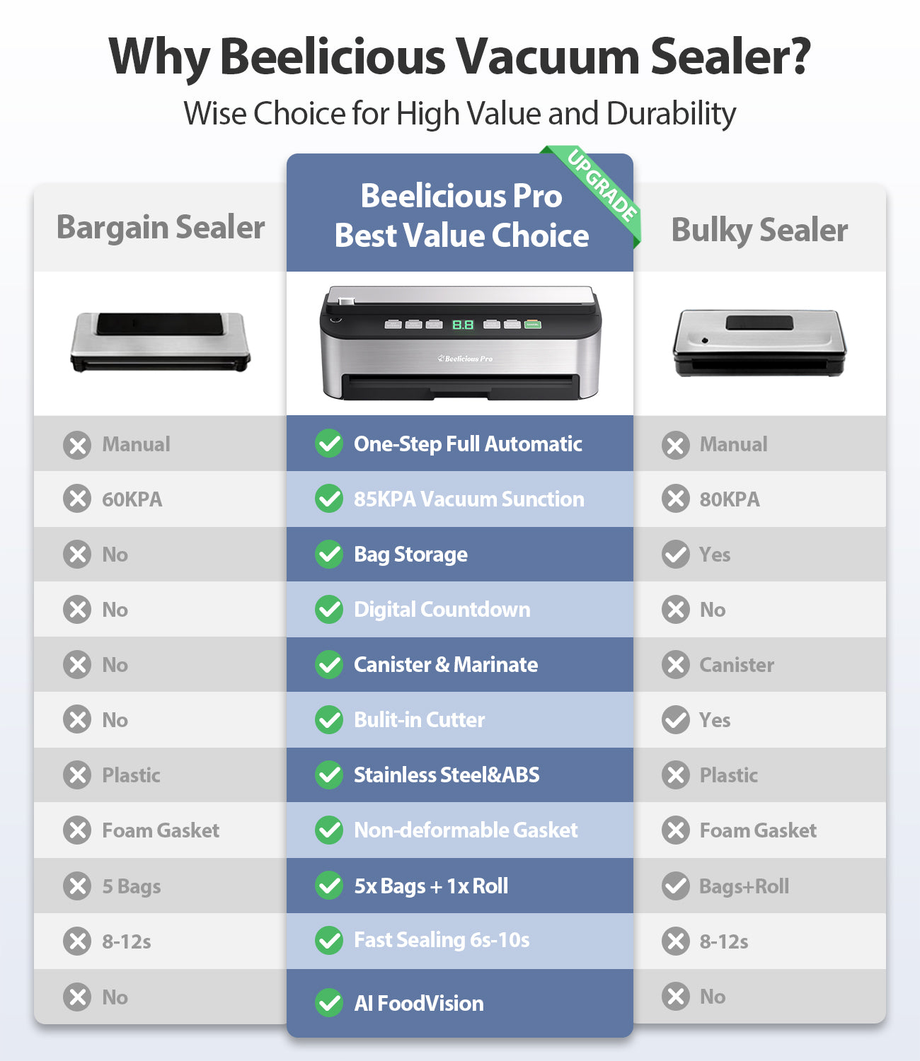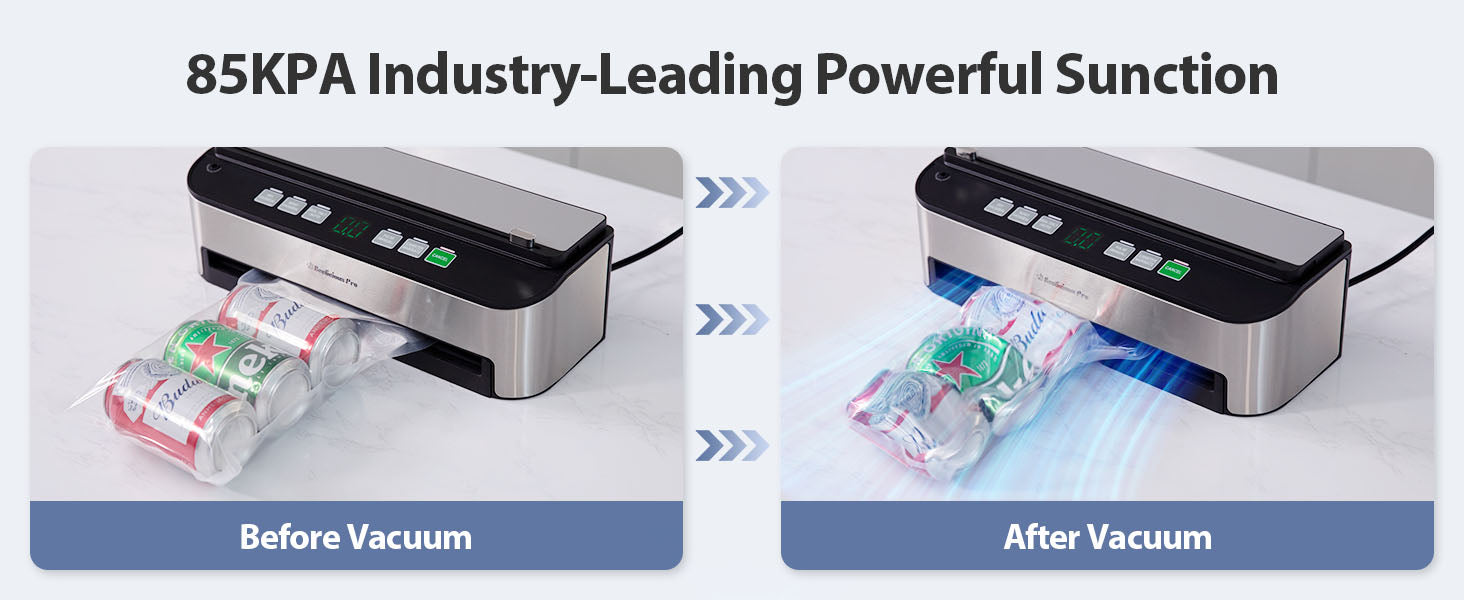 - 【85KPA Industry-Leading Suction】 Beelicious Vacuum Sealer boasts 120 watts of high power, achieving a rapid vacuum speed of 12 liters/minute. The pure copper core pump ensures corrosion resistance, heat resistance, and friction resistance, delivering an industry-leading suction power of up to 85KPA.